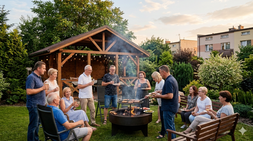 Warto pamiętać o aspekcie oświetleniowym. Płonące palenisko tarasowe generuje ciepłe, dynamiczne światło, które modeluje przestrzeń po zmroku. Jest to o wiele bardziej szlachetne źródło światła niż elektryczne lampy ogrodowe. Ogień buduje intymność, sprzyja szczerym rozmowom i pozwala na głęboki relaks po pracy.